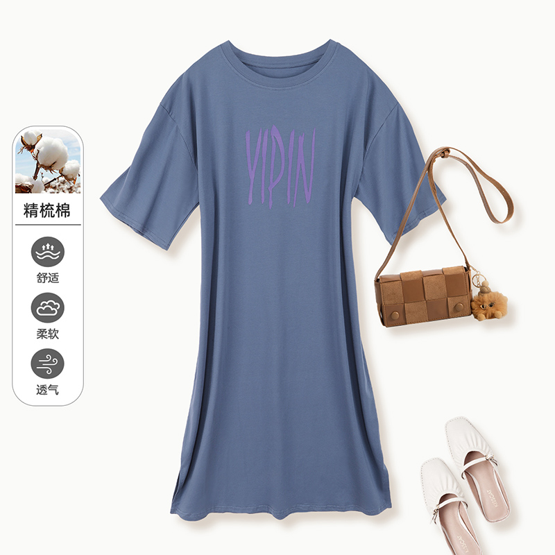 邑品女式连衣裙 夏季宽松纯棉短袖T恤裙 蓝色字母薄款运动休闲裙