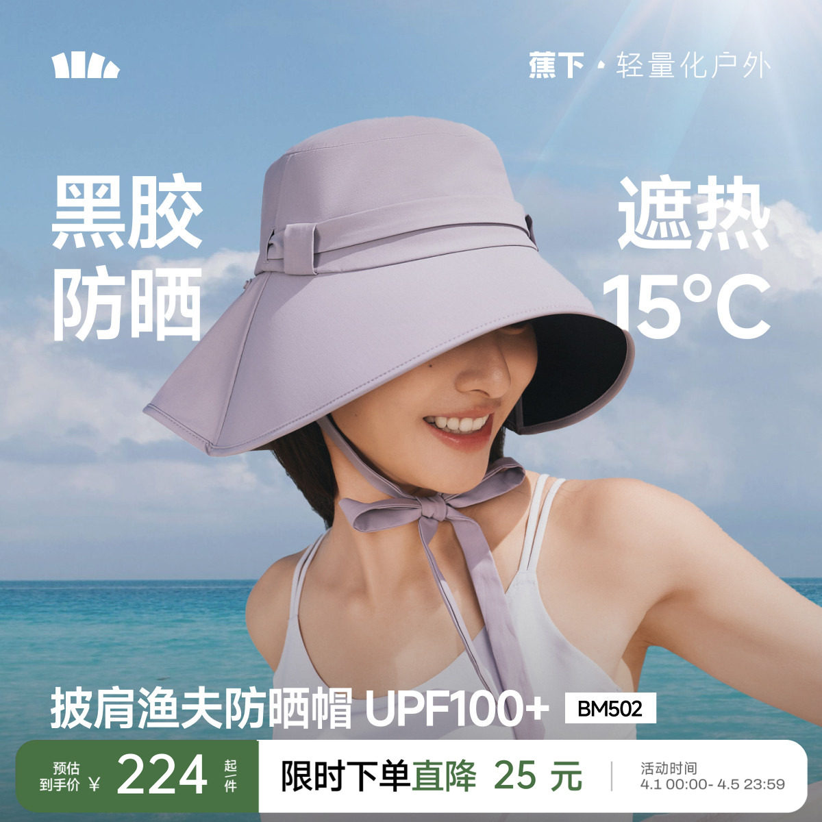 蕉下飘带渔夫帽2026新款后颈披肩蝴蝶结旅游遮阳显脸小海边防晒帽