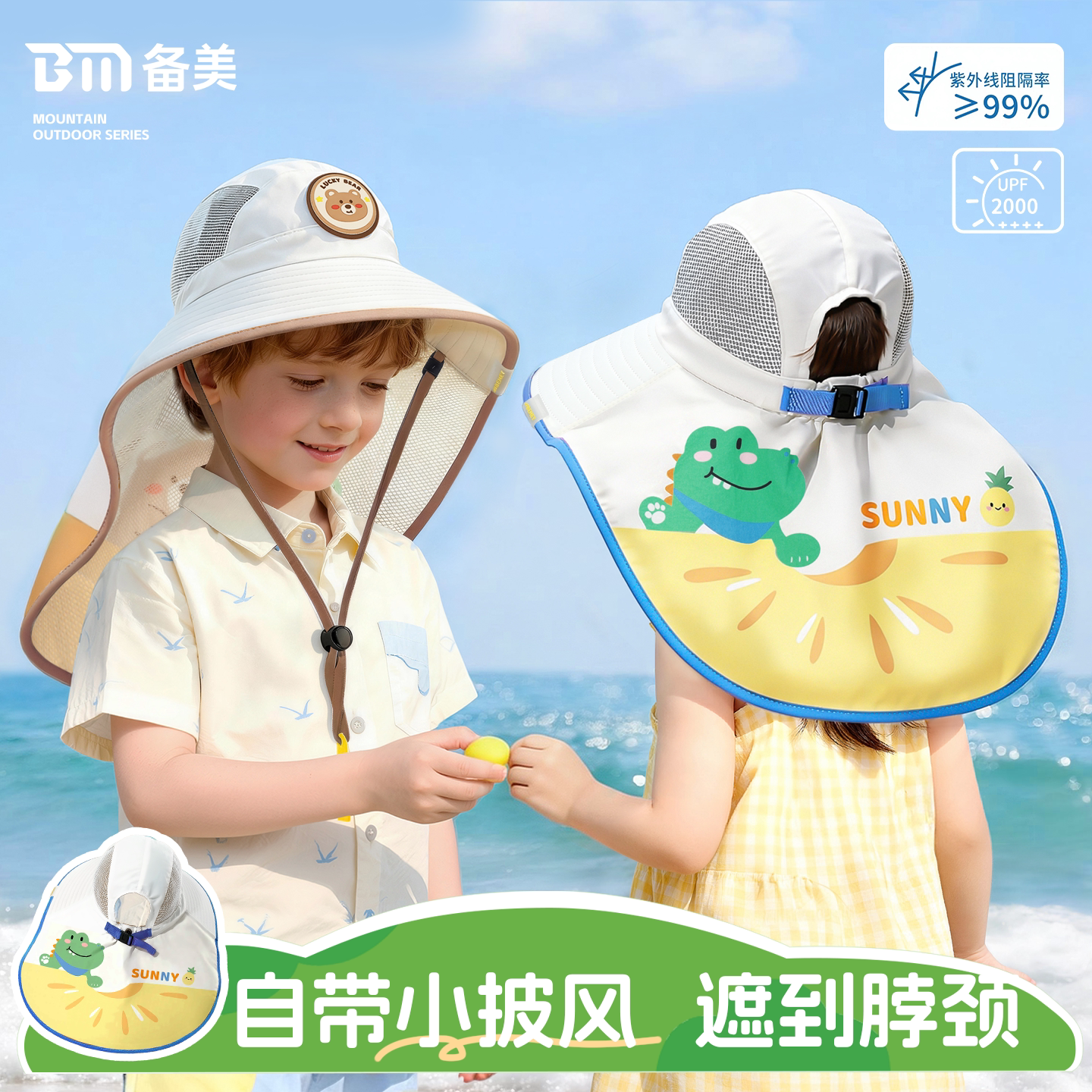 备美儿童防晒帽夏季防紫外线男童遮阳帽宝宝太阳帽女童大披肩新款