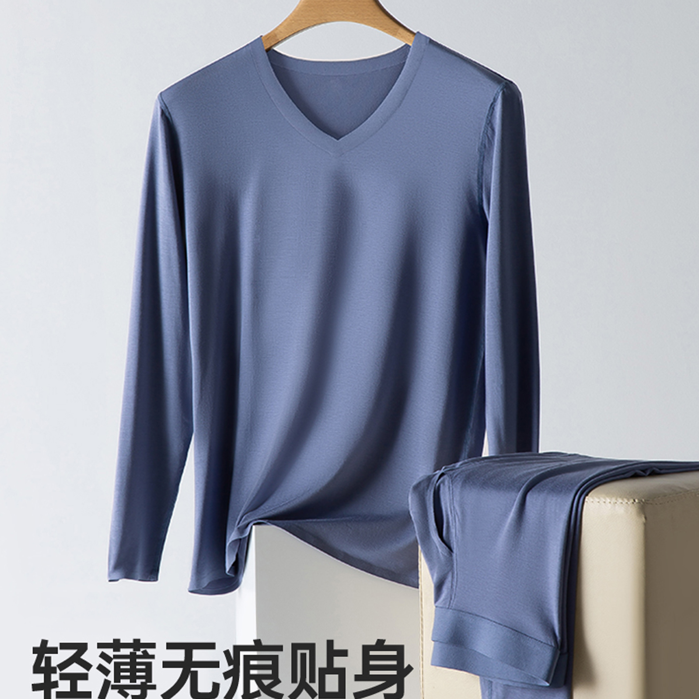 芬腾无痕莫代尔秋衣秋裤套装打底衫新款秋季薄款V领保暖内衣男士