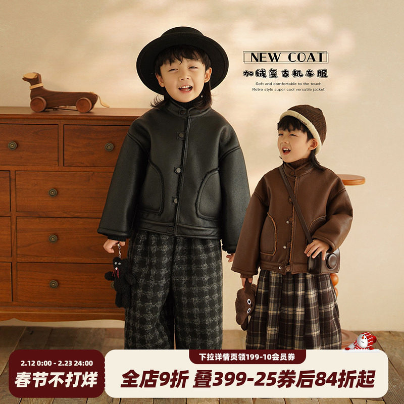 砚台家复古儿童加绒皮衣男童保暖外套宝宝立领机车服小童夹克冬款
