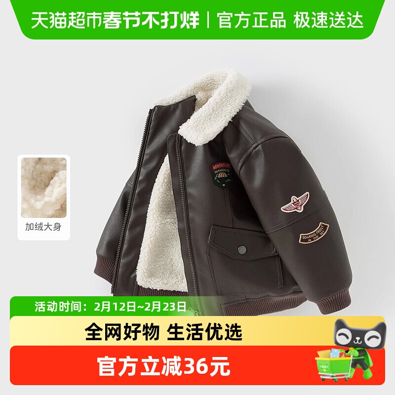 戴维贝拉儿童加绒外套男童冬装夹克皮衣2025新款宝宝飞行员上衣