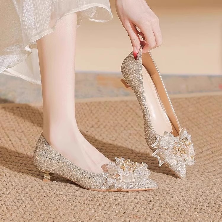金色水晶鞋高跟鞋女低跟3cm银色伴娘婚鞋浅口粗跟尖头晚宴单年会