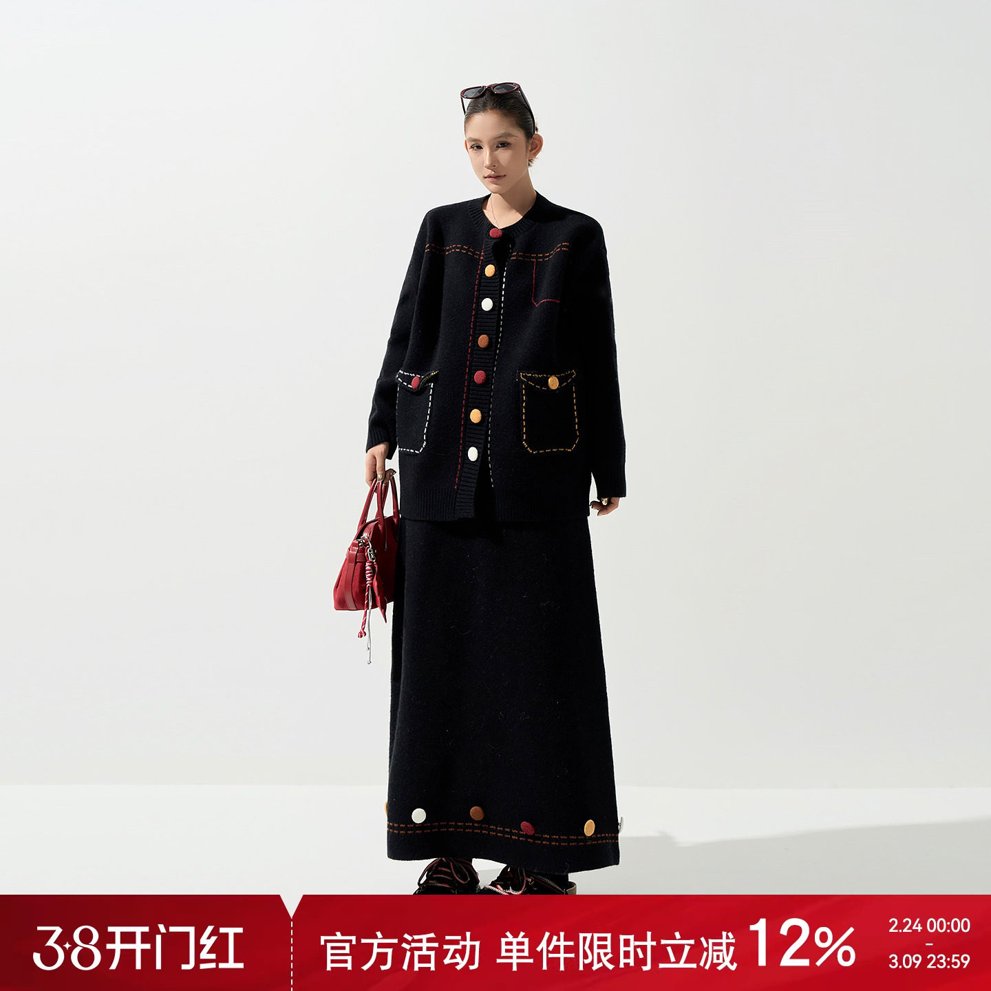 吴童童彩扣圆领加厚长袖毛衣外套女秋冬韩系宽松针织开衫半裙套装