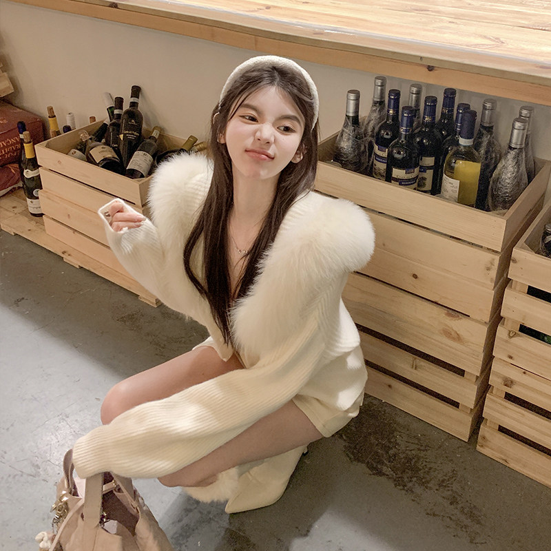 大于诗集 凛冬恋歌 大翻领狐狸毛海军领针织开衫女加厚毛衣外套冬