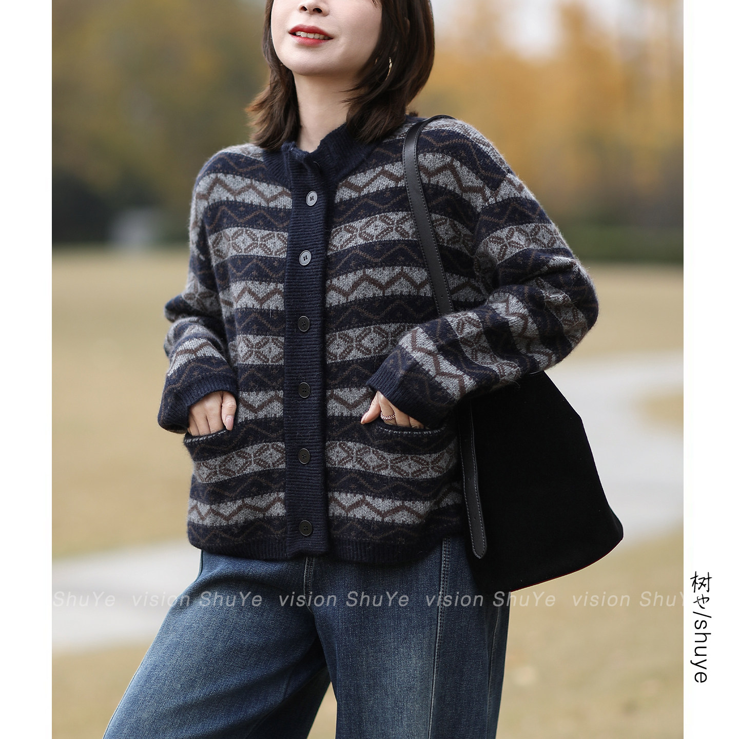树也 软糯质感 文艺复古几何提花立领羊毛混纺加厚毛衣开衫外套女