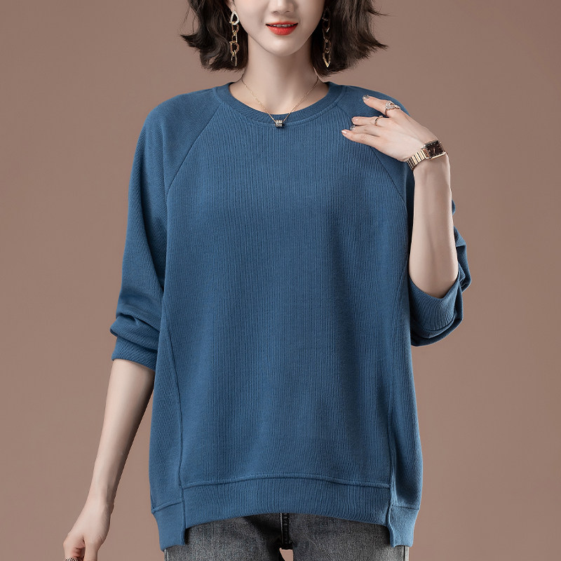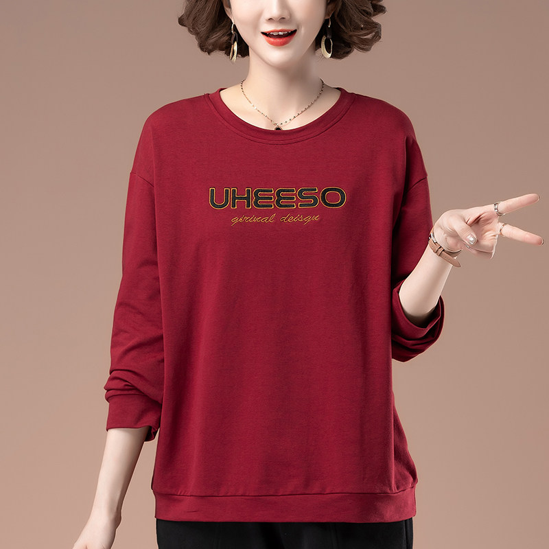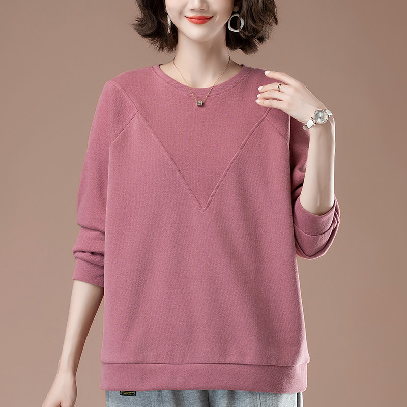 加肥加大码女装薄款卫衣春秋新款中年妈妈百搭圆领套头显瘦打底衫