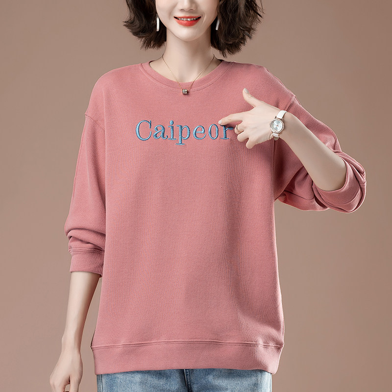 中年妈妈卫衣女春秋薄款加肥加大码女装宽松休闲刺绣圆领套头上衣
