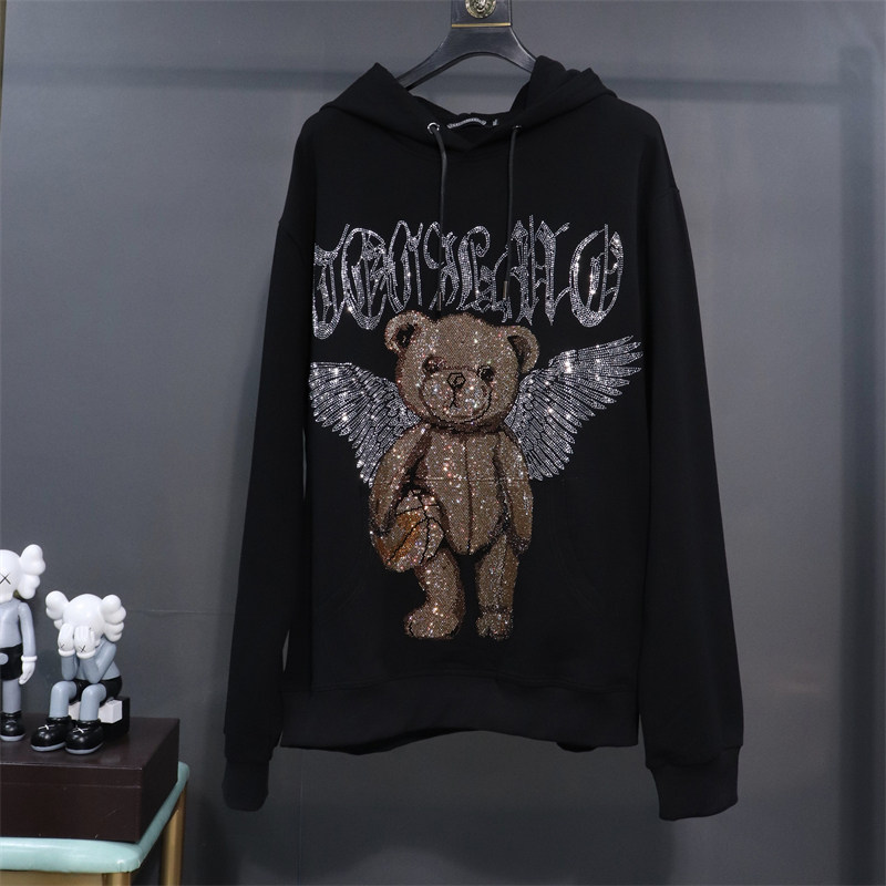 加肥加大英式潮牌T家大C重工烫钻翅膀熊套头连帽宽松卫衣男女通穿