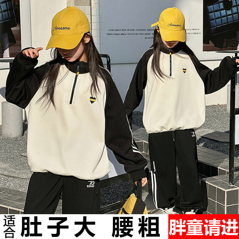 胖女童卫衣春秋加肥加大码中大童半高领套头衫青少年拼接长袖上衣