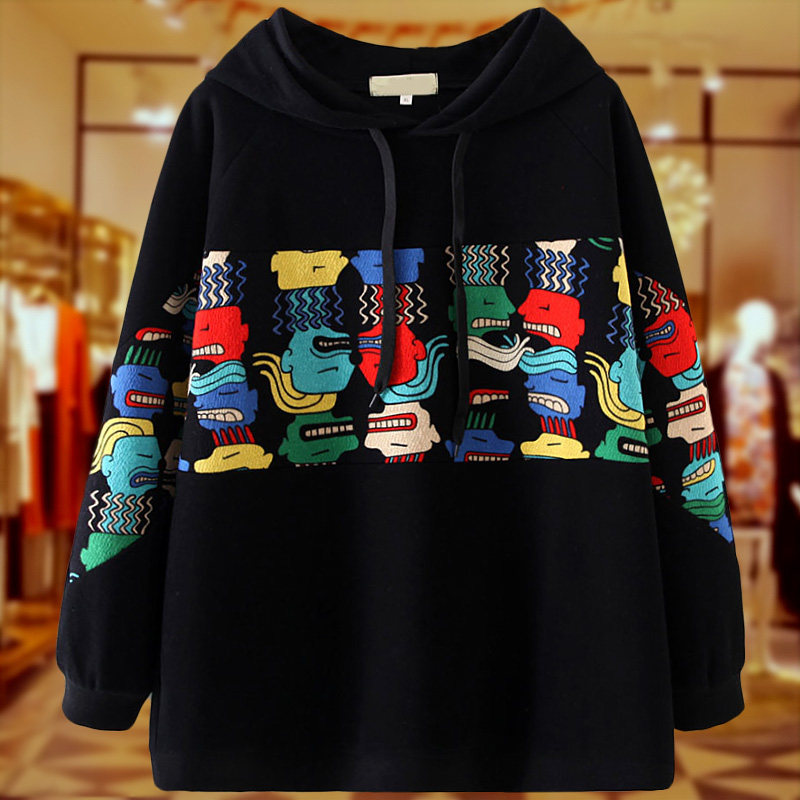 连帽卫衣女春秋加肥加大码女装宽松中年妈妈休闲百搭黑色套头上衣