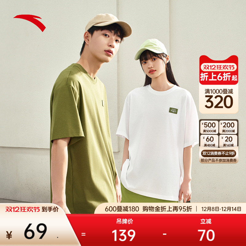 安踏短袖t恤男女同款夏季简约纯色圆领半袖宽松透气情侣休闲上衣