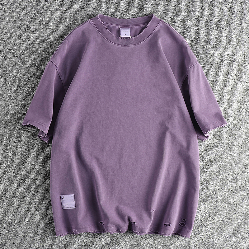个性割烂做破工艺成衣染色水洗复古高街短袖T恤男 宽松潮流半袖