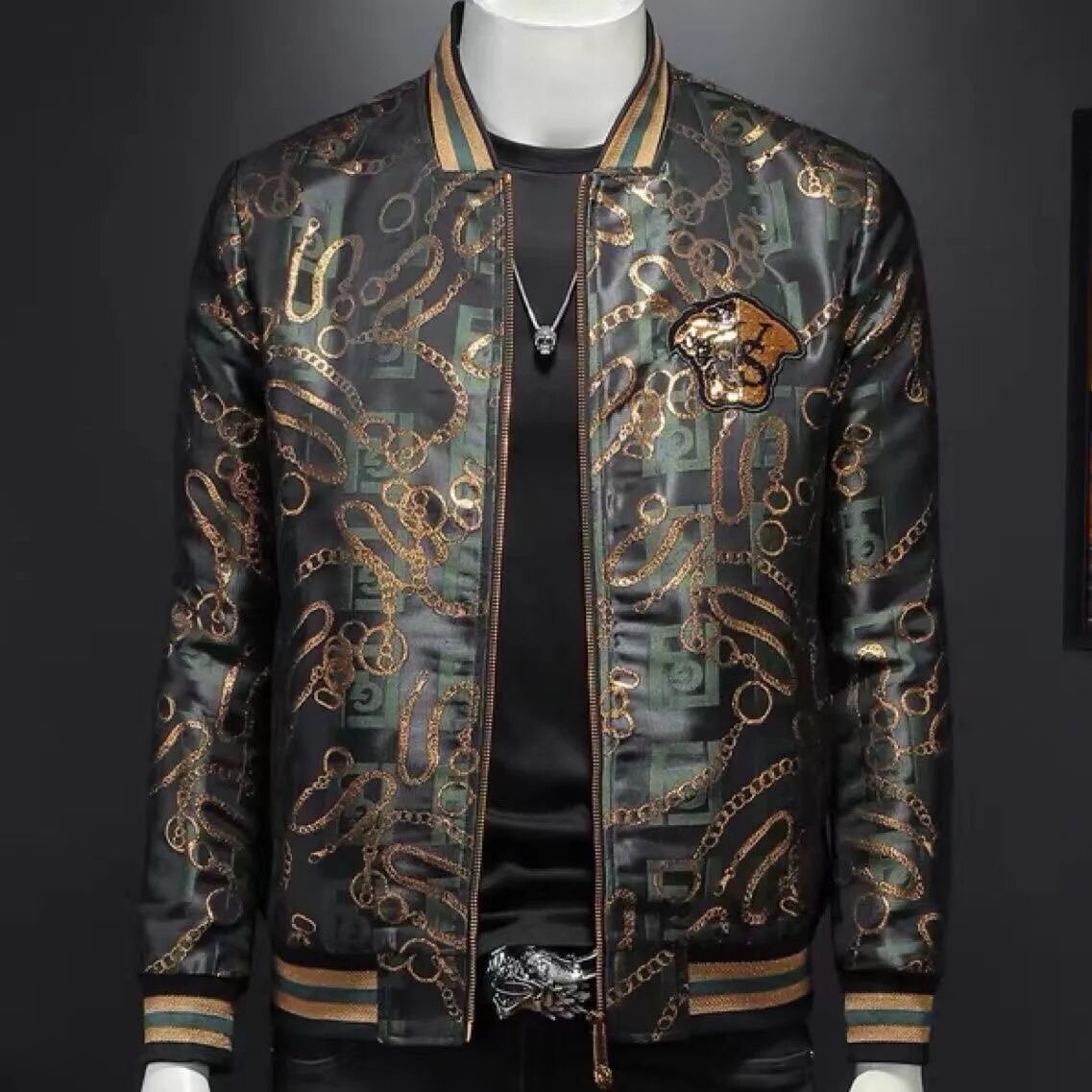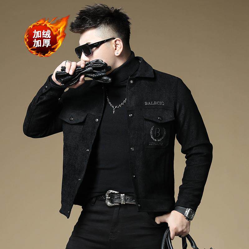 欧洲站秋冬翻领男士夹克潮牌亮片刺绣新款修身加绒加厚男上衣外套