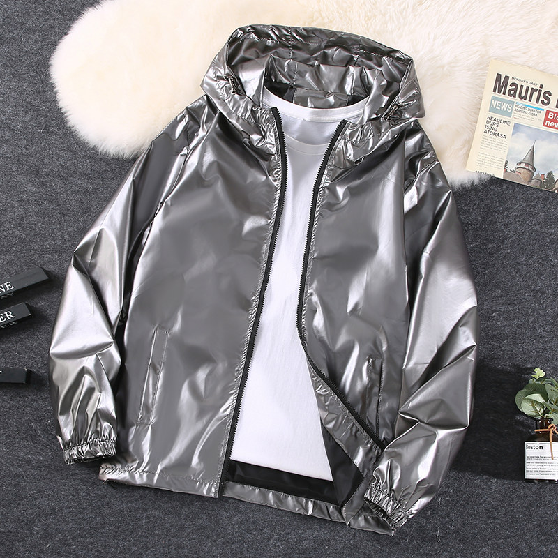 男士连帽外套大码新款潮流韩版帅气春秋欧洲站亮面反光休闲夹克男