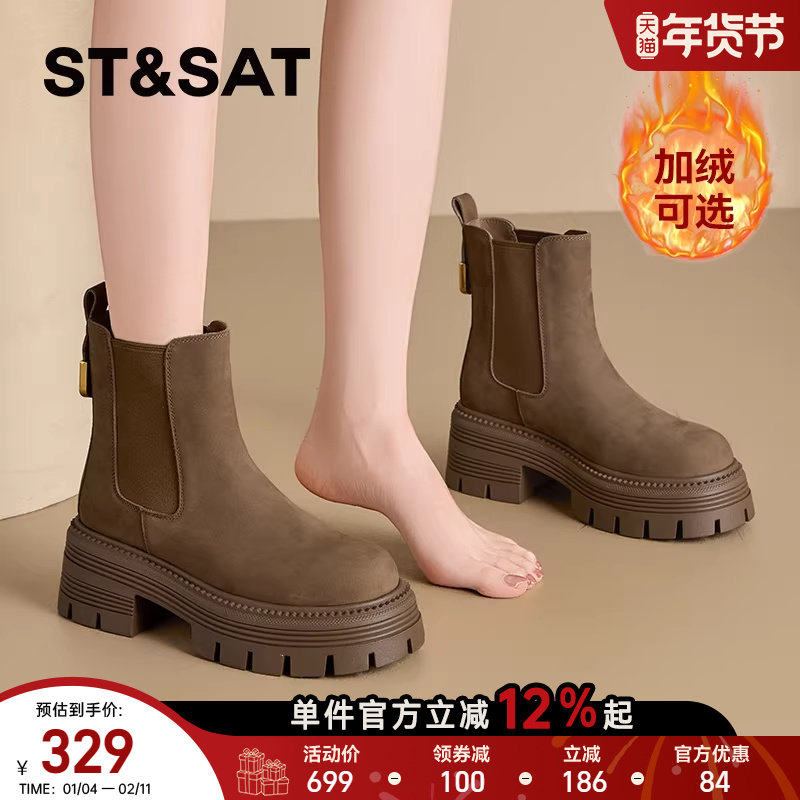 【牛皮真皮加绒】星期六厚底增高切尔西鞋女短款冬季美德拉烟筒靴
