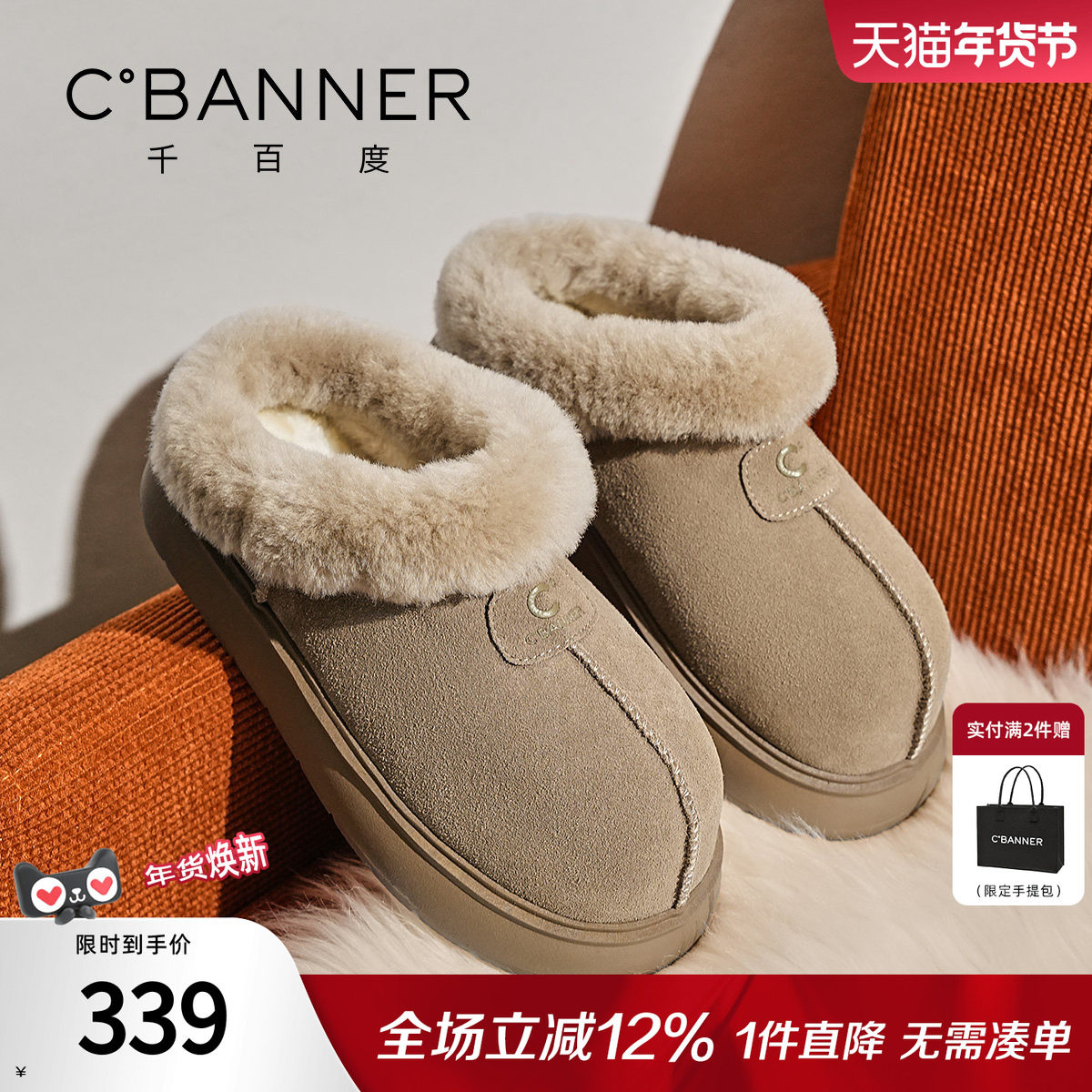 千百度厚底毛毛勃肯拖鞋女系带松糕新款百搭加绒棉鞋短款雪地靴女