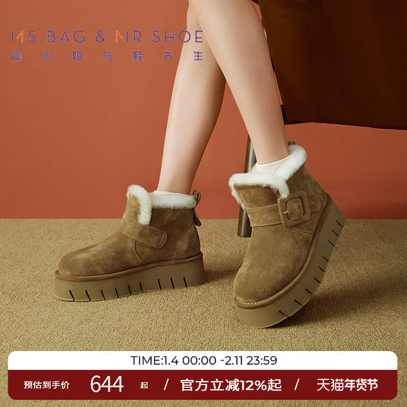 【真皮反绒牛皮】星期六毛绒绒勃肯雪地靴女短款加厚加绒保暖棉靴