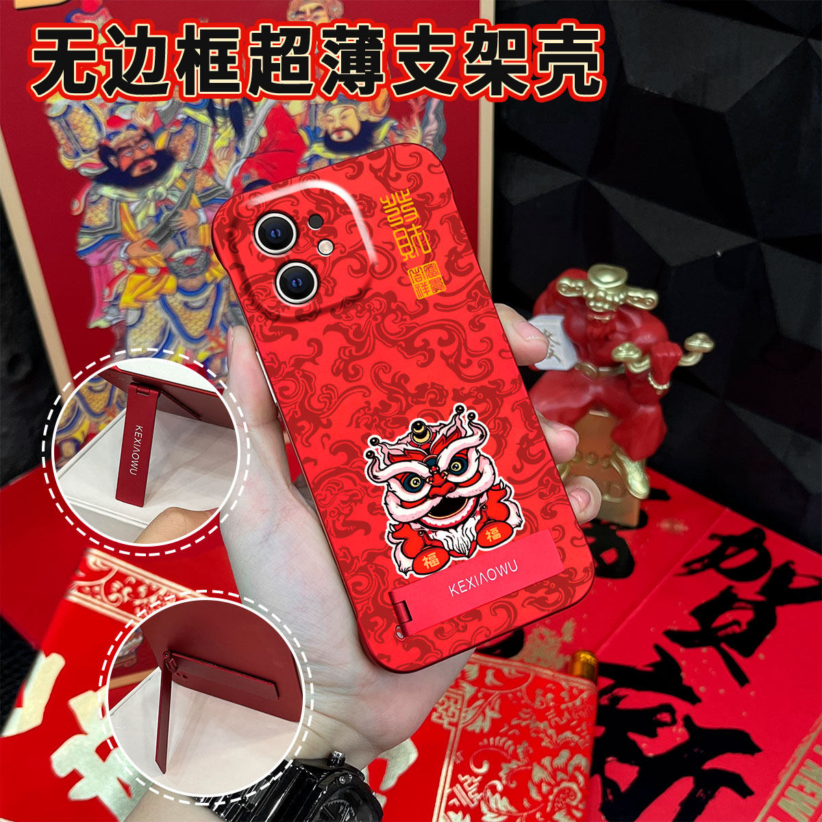 适用苹果11/12浮雕舞狮13/14promax超薄无边框12mini/13mini手机壳x/xsmax支架7/7plus国风14/15plus新年款xr