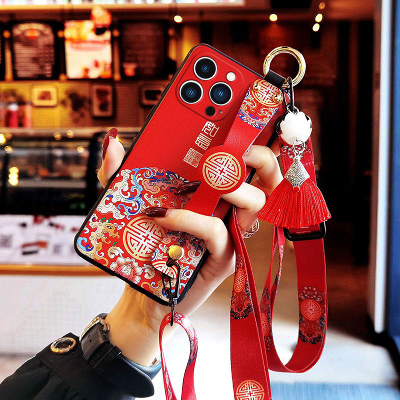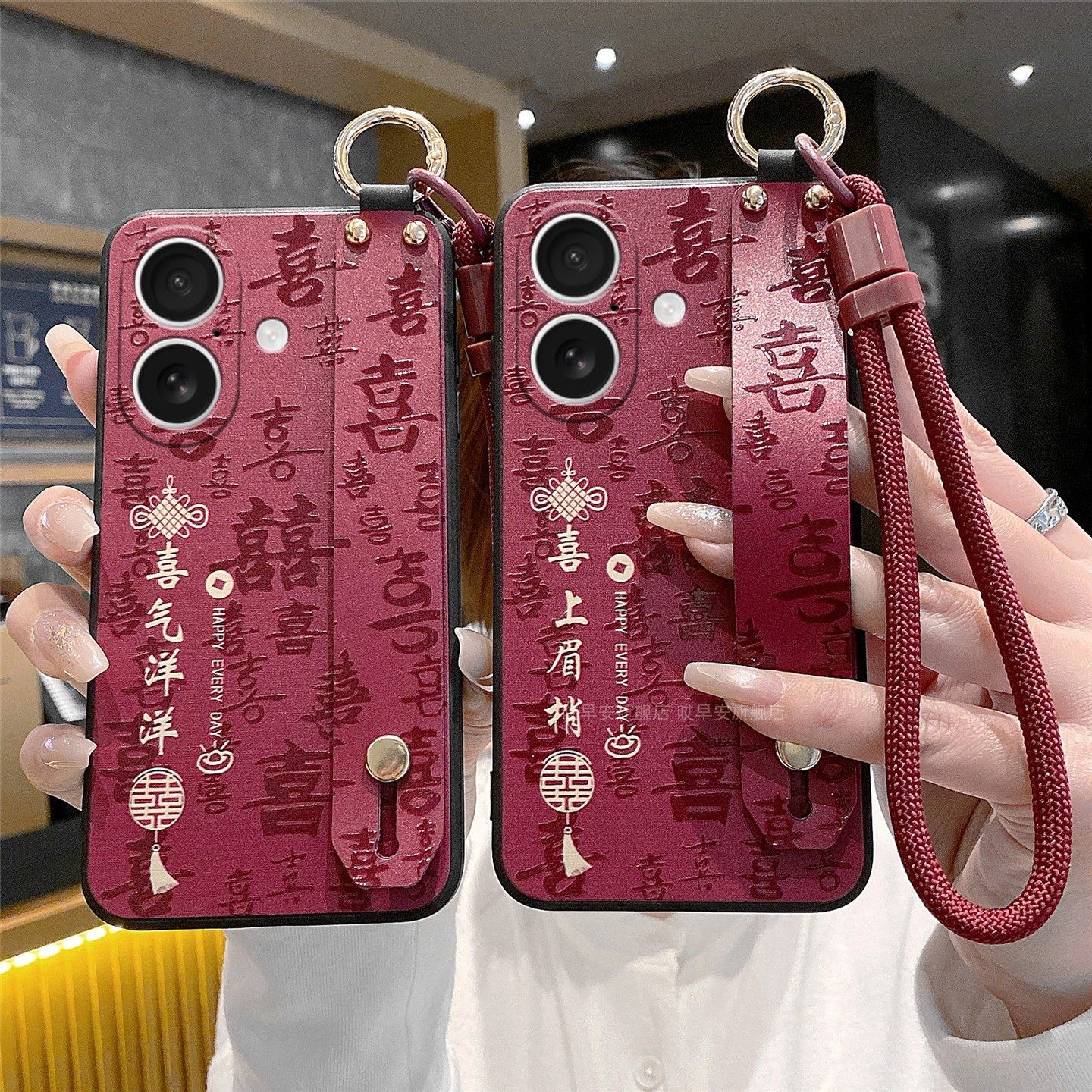 新年适用苹果17手机壳iphone16保护套15硅胶14浮雕13腕带12全包支架11Pro防摔XR女max中国红8新款7plus带手绳
