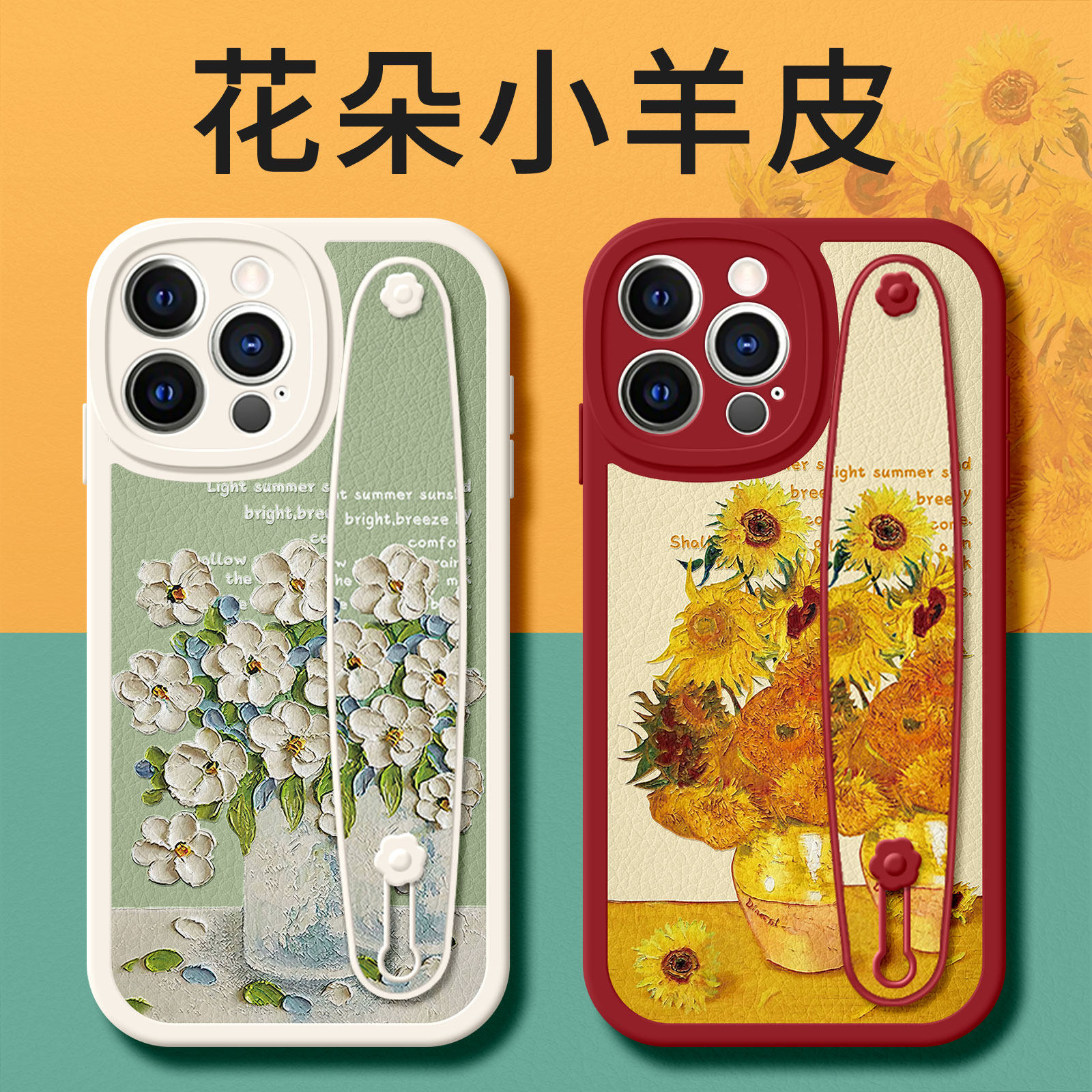适用苹果16ProMax手机壳15Pro油画花朵iPhone13郁金香11腕带12支架14plus保护套X菊花XS女款7防摔8浮雕SE硅胶