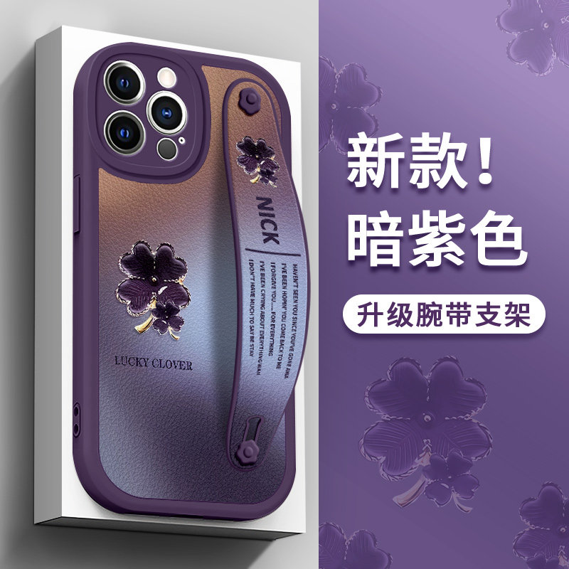 适用苹果16ProMax手机壳iPhone13暗紫15Pro四叶草12腕带11支架14plus防摔8新7保护XS套XR浮雕SE硅胶XSmax女款