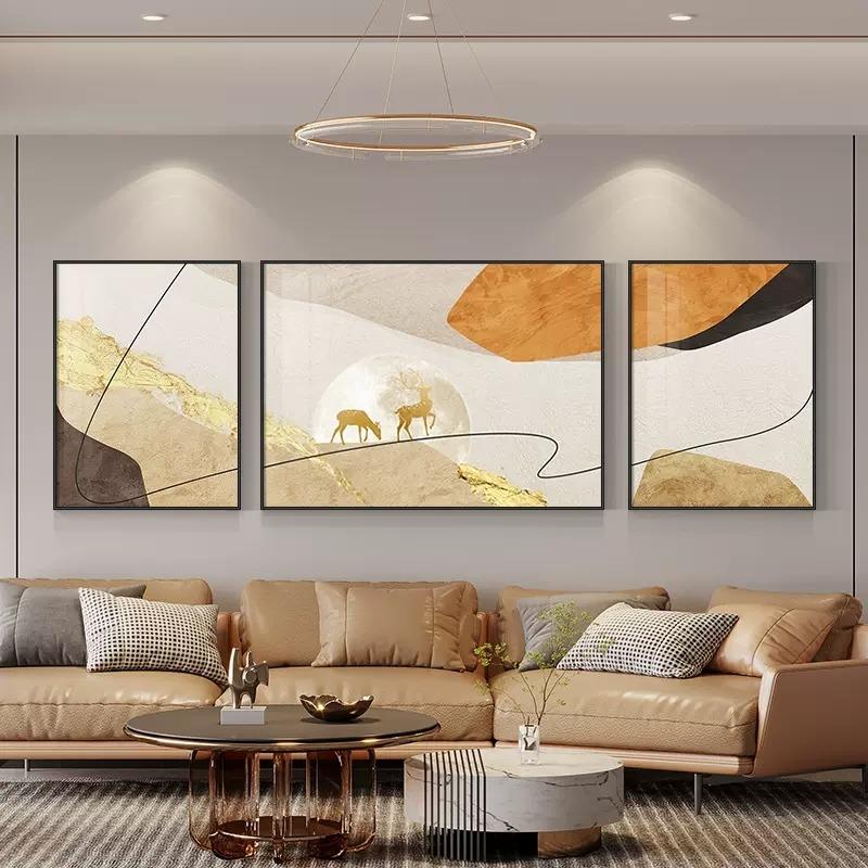 客厅装饰画摆件背有靠山麋鹿抽象沙发背景墙挂画高档发财树三联画