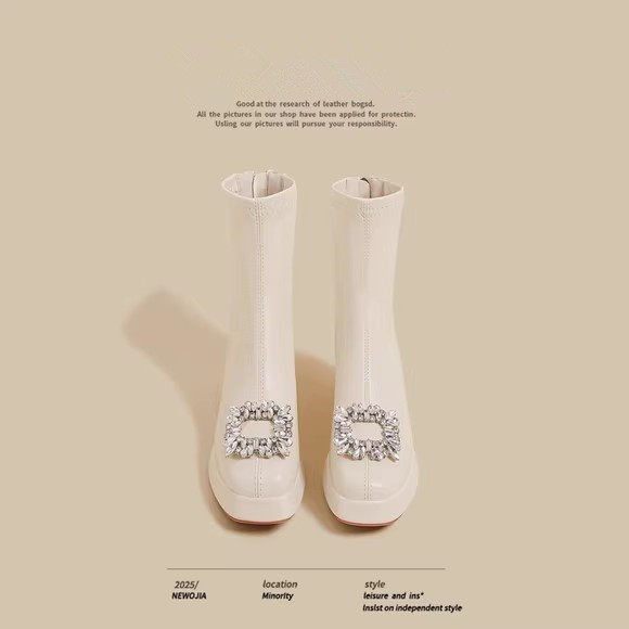 2025秋冬季新款粗高跟切尔西短靴女白色水钻防水台显瘦弹力短靴子