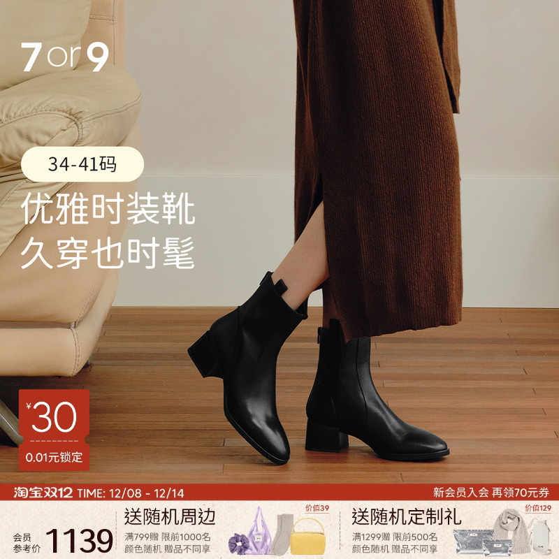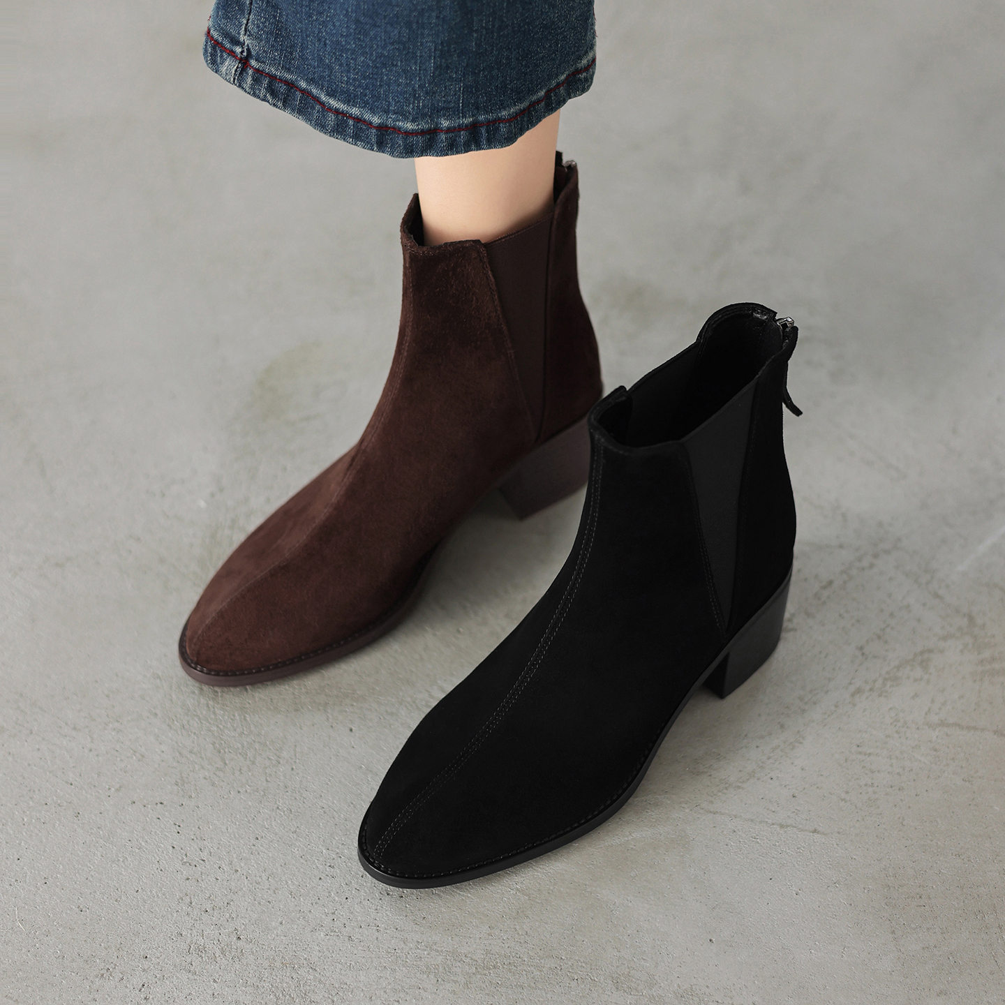 7or9短靴女鞋秋冬切尔西靴绒面真皮粗跟高跟靴瘦瘦靴靴子燕麦吐司