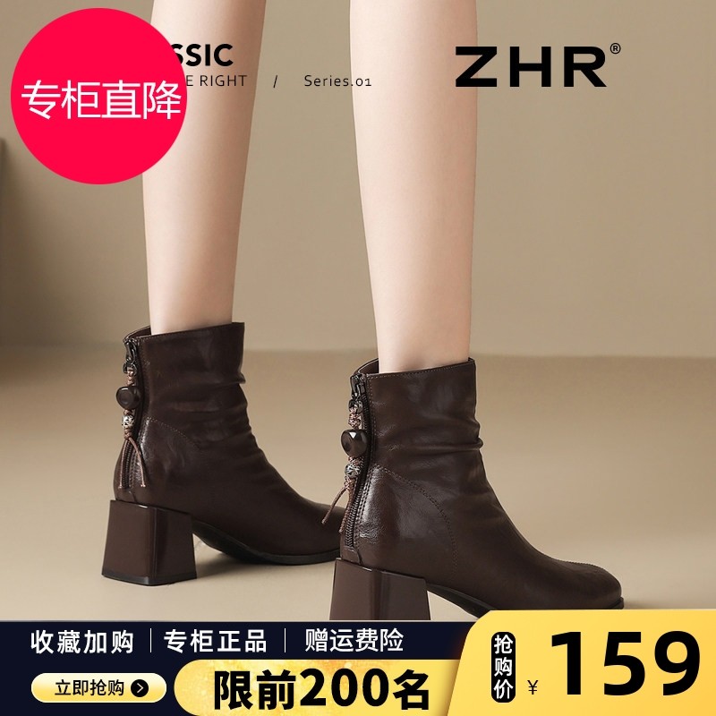 ZHR棕色高跟切尔西短靴女2025秋冬新款加绒方头瘦瘦靴粗跟妈妈靴