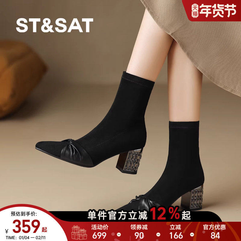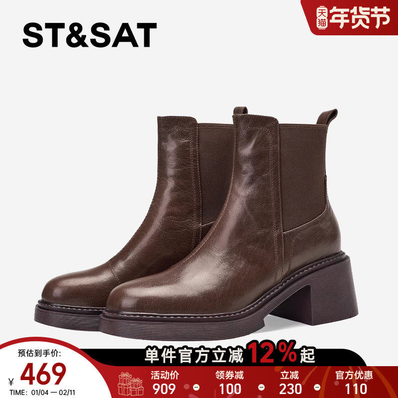星期六秋冬新款复古切尔西瘦瘦靴女粗高跟方头短靴通勤百搭时装靴