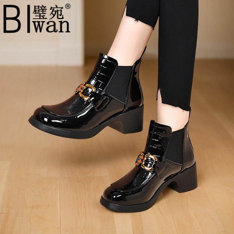 秋冬款漆皮高跟切尔西短靴女鞋加绒保暖粗跟烟筒靴真皮时尚马丁靴