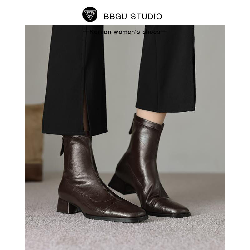 BB古 韩国真皮2025年新款秋冬高跟切尔西短靴女棕色粗跟弹力靴