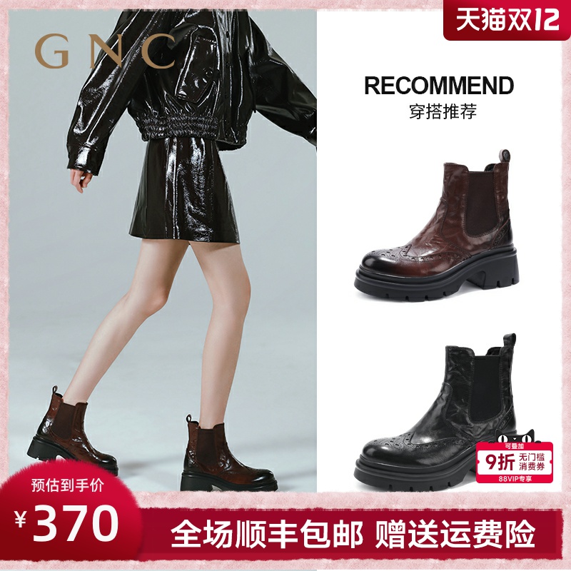 GNC复古粗高跟切尔西短靴女2025冬新款擦色百搭布洛克雕花时装靴