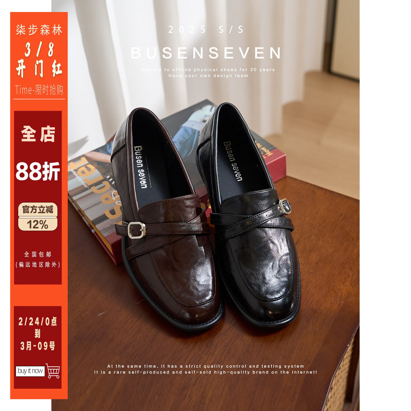 柒步森林高级气质低平跟复古英伦皮带扣通勤牛皮乐福单鞋子女新款