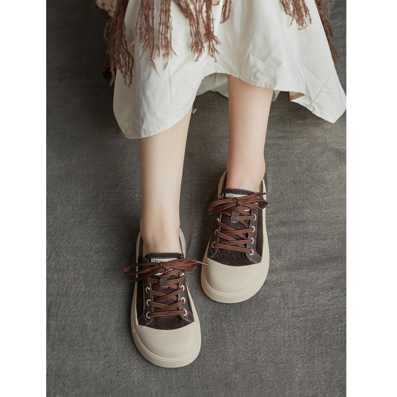丑萌运动鞋2026春季新款圆头英伦风拼色真皮系带平跟户外鞋单鞋
