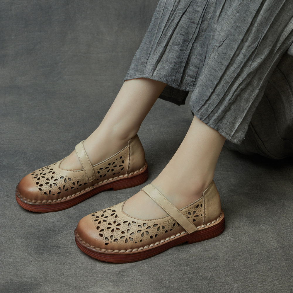 打孔单鞋2026春夏新款英伦风真皮圆头镂空魔术贴女鞋平跟软底单鞋