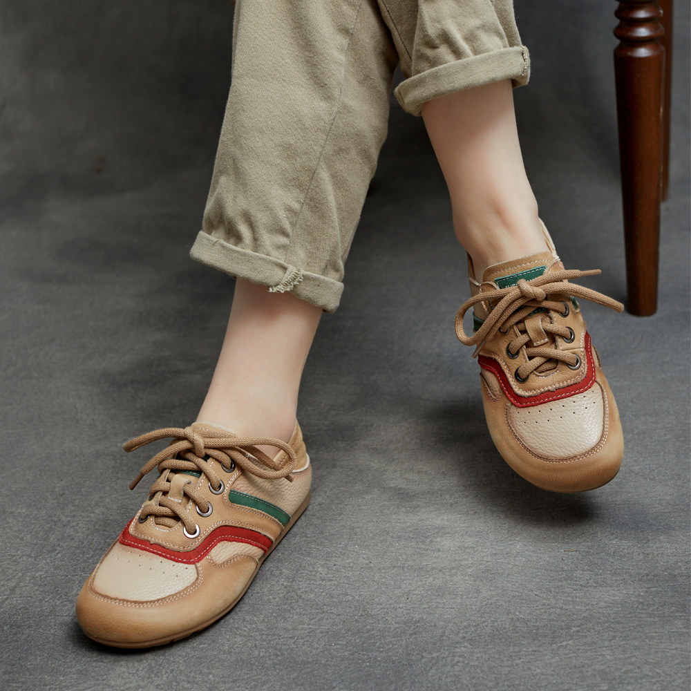 拼色平跟单鞋2026春季新款圆头英伦风真皮系带休闲平底单鞋软底鞋