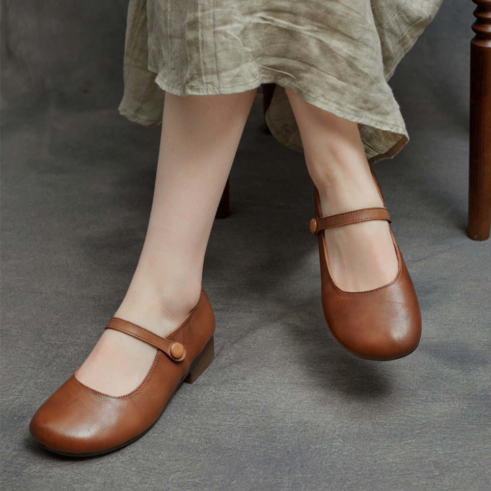 2025春季新款真皮英伦风手工圆头扣带软皮平跟单鞋牛皮勃肯单鞋女