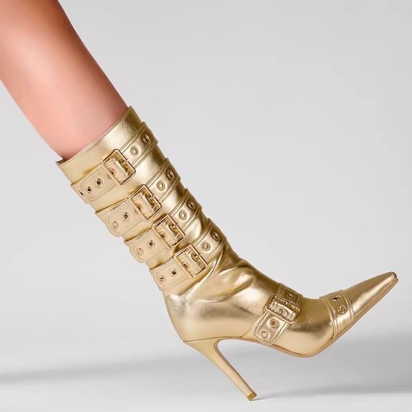 JR尖头细跟皮带扣高跟鞋女军装朋克高跟中筒靴多扣带设计时装靴子