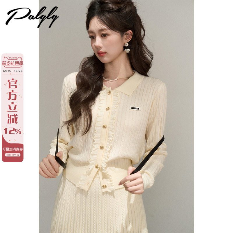 菲梦伊亮片小香风套装女冬季荷叶边名媛盘扣毛呢外套半身裙两件套