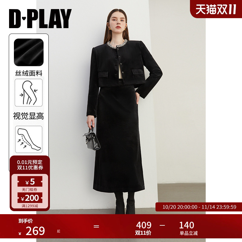 DPLAY2025春季黑色小香风套装女气质外套高腰丝绒直筒半身裙搭配