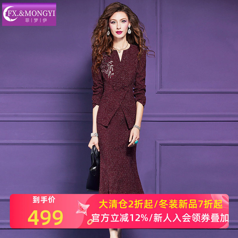 菲梦伊红色亮片小香风套装女秋冬季富贵名媛千金毛呢外套包臀半裙