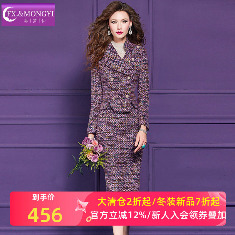 菲梦伊紫色格子小香风套装女冬季名媛高贵西装领毛呢外套包臀半裙