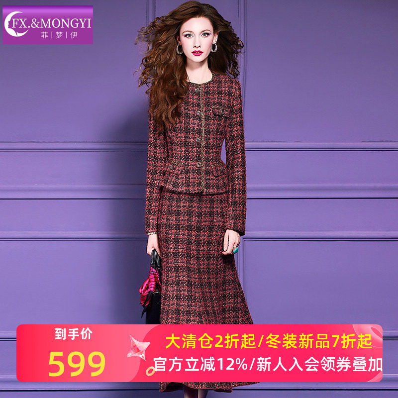 菲梦伊含羊毛格子小香风套装女冬季名媛高端加厚毛呢外套鱼尾半裙