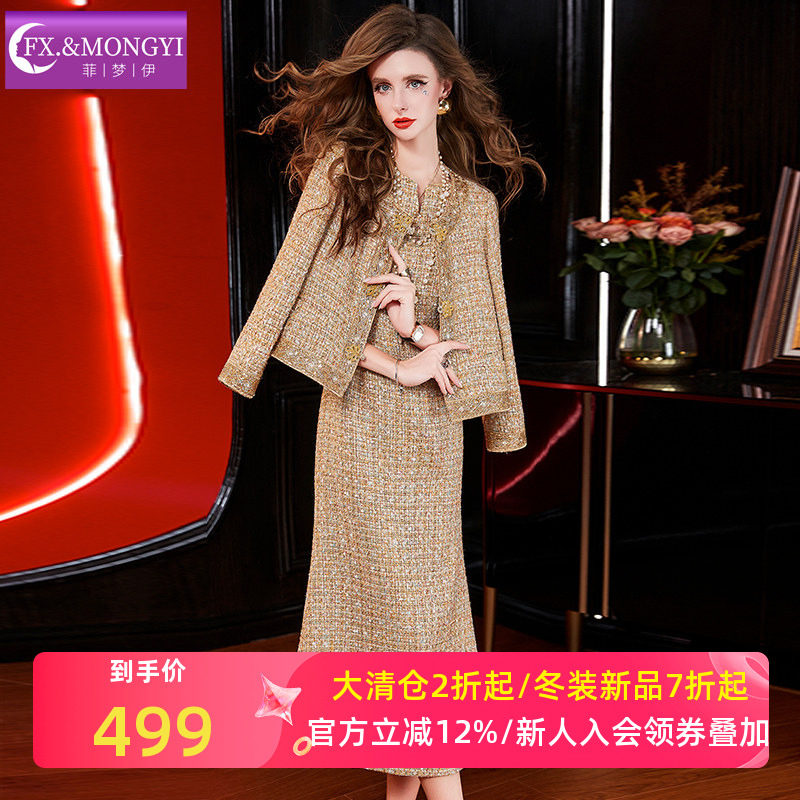菲梦伊高级感小香风套装女冬季轻熟优雅亮片西装领毛呢外套鱼尾裙