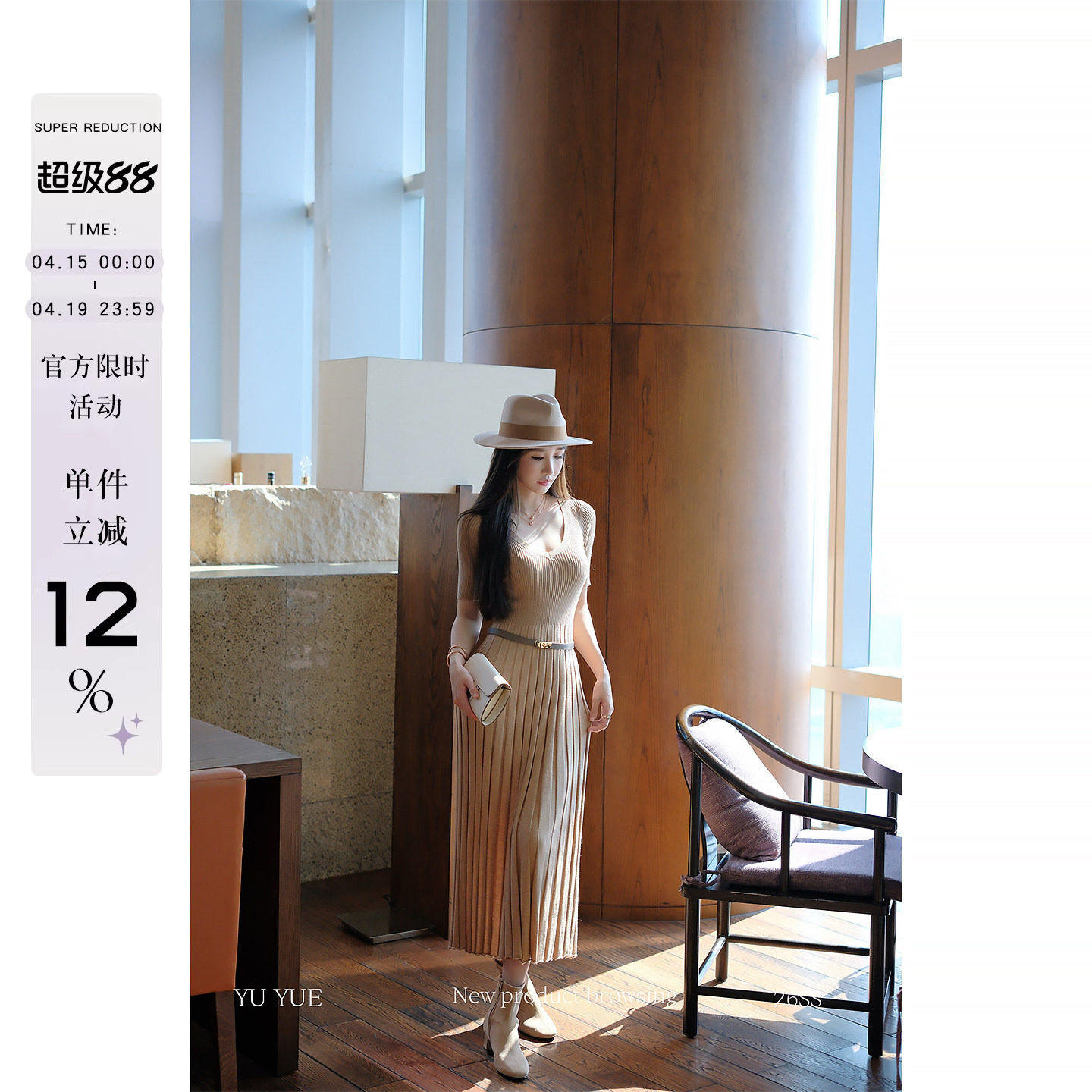 XULU原创夏季针织烫金优雅礼服裙气质修身显瘦收腰V领连衣裙