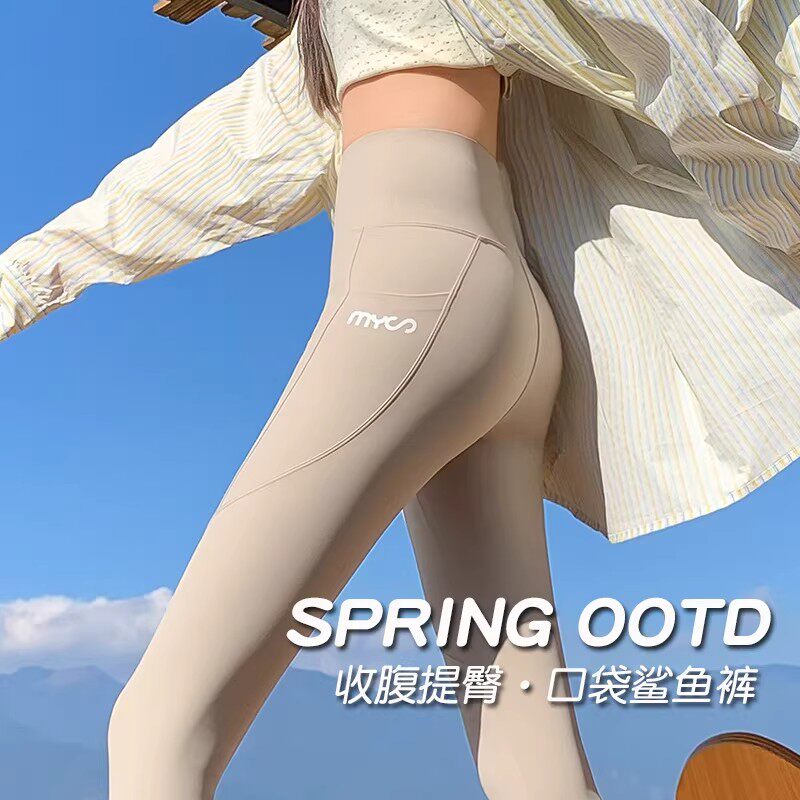 QY鲨鱼裤春季芭比紧身长裤高腰收腹侧口袋薄款外穿瑜伽运动打底裤