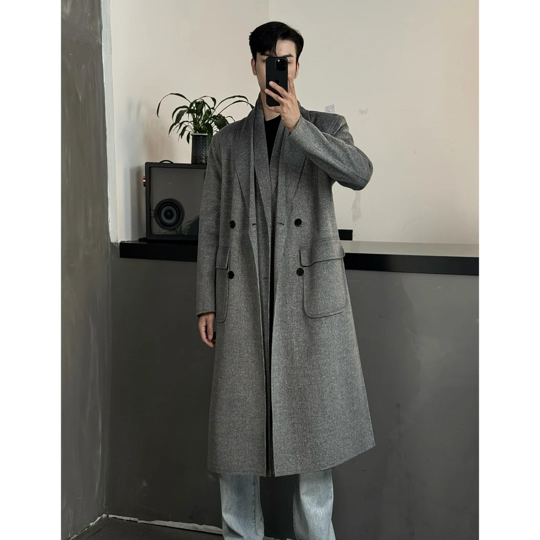 秋冬季羊毛双面呢大衣男士垫肩超长款过膝西装领韩式呢子风衣外套