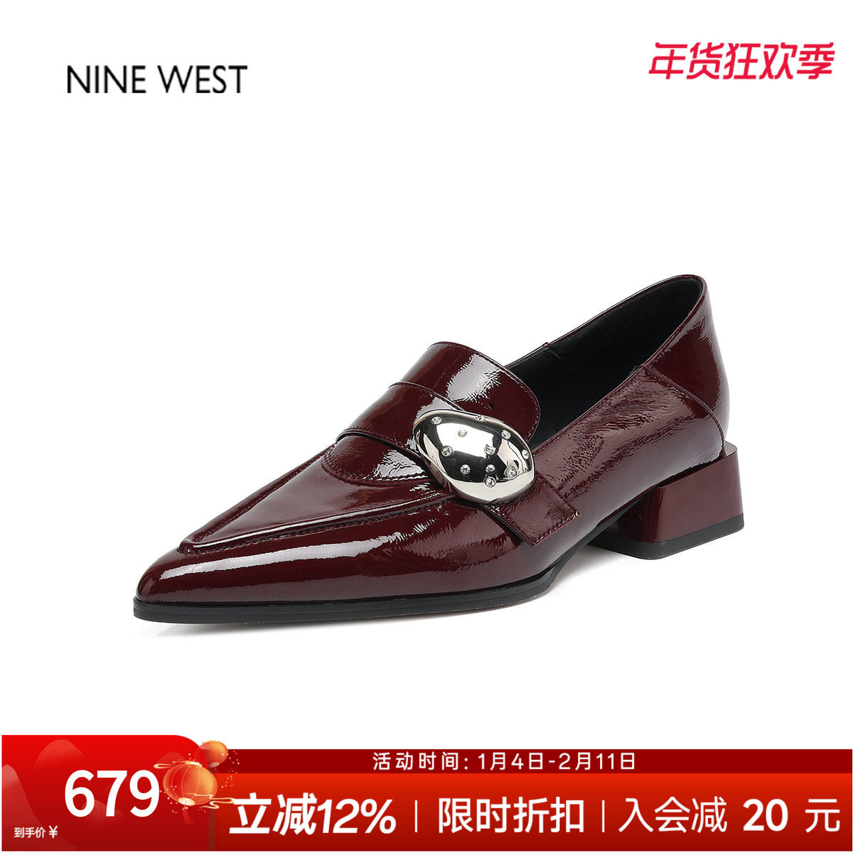 奥莱专供Nine West/玖熙金属粗跟一脚蹬乐福鞋尖头皮鞋气质单鞋